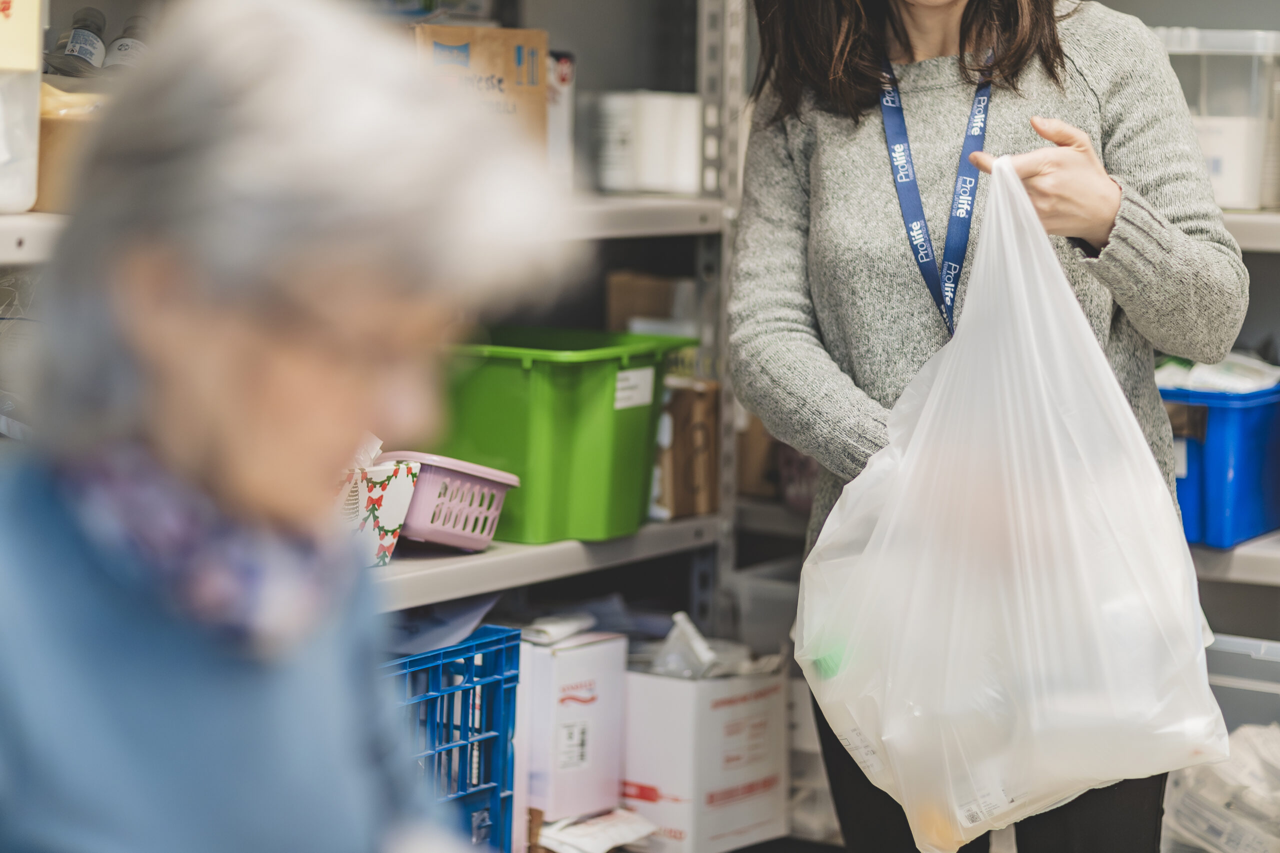 Due persone della fondazione mentre gestiscono la distribuzione domiciliare dei farmaci agli assistiti.